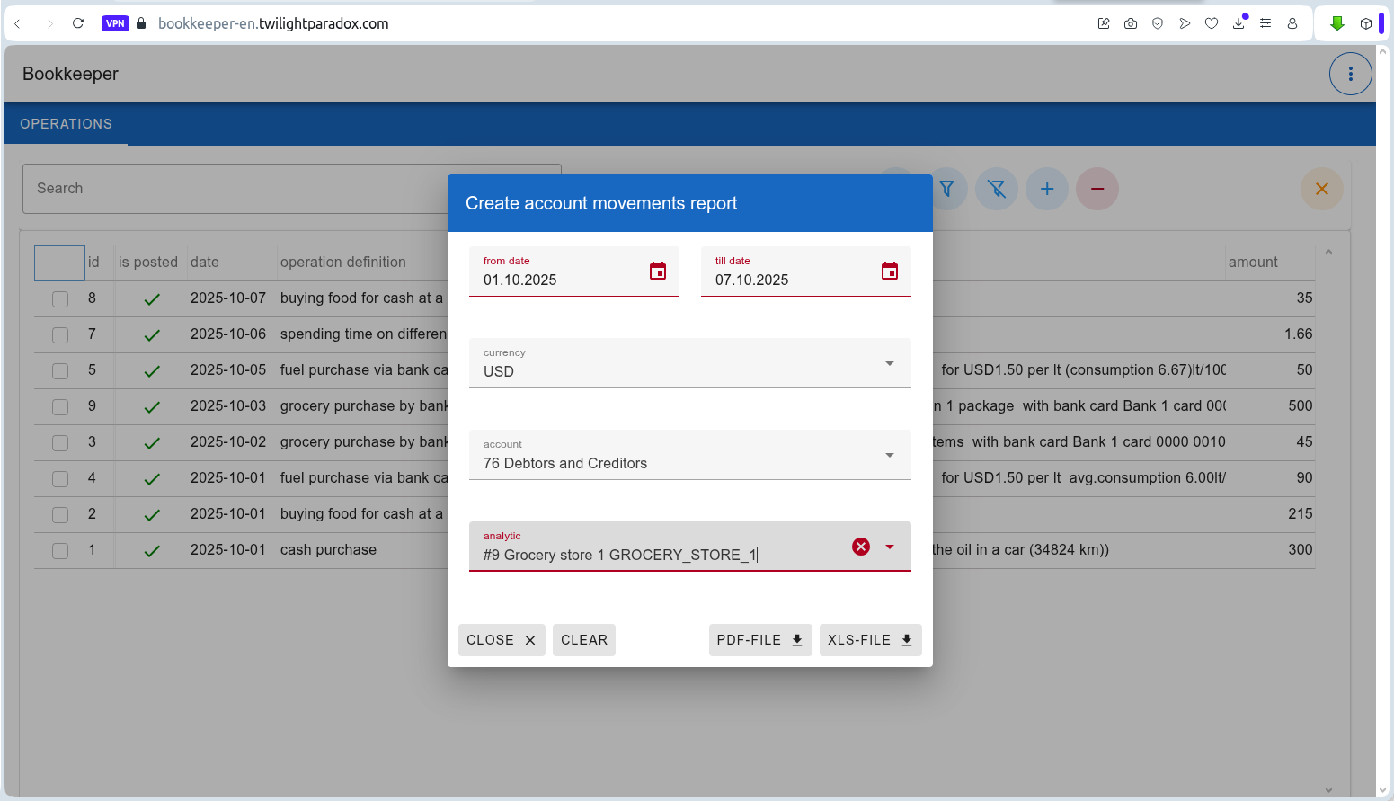 To generate a report, select the desired one from the main menu, fill in the parameters, and click “PDF” to download a PDF version or “XLS” to get an Excel spreadsheet.