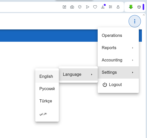The application is initially configured to open in the same language as this page. If you want to change the interface language, you can choose one of the built-in languages from the menu.